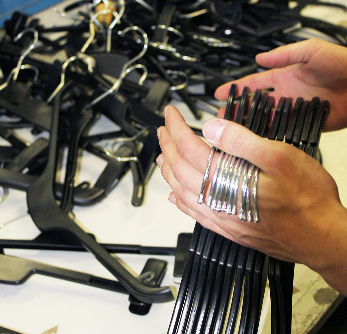 Besonders die technische Funktion des Kleiderbügels wird durch uns nachhaltig begutachtet. Wir sensibilisieren und verbessern kontinuierlich unser Qualitätsmanagement, um unseren Kunden ein einwandfreies Produkt zu garantieren. Zum Beispiel der Haken; an dem alles „hängt“. Er muß belastbar sein und den Anforderungen in der Fördertechnik standhalten. Deshalb ist die optionale patentierte Refixierung des Metallhakens wichtig, um negative Einflüsse in High-Speed-Sortern auszuschließen.